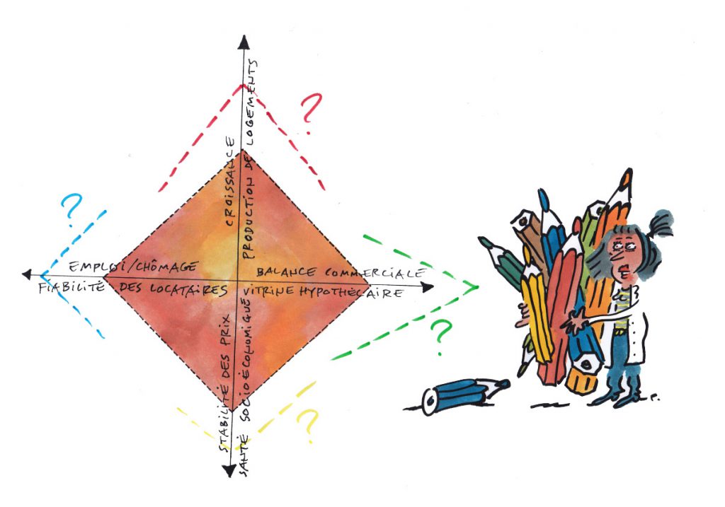 Comment produire la quantité optimale de logements afin qu’il y ait stabilité des prix ? Comment maîtriser le mouvement des axes « fiabilité des locataires » et « santé socio-économique » ? Ici interviennent dans l’observation des phénomènes, le taux de chômage, l’inflation, le taux de croissance (% PIB), le résultat du commerce extérieur ou balance commerciale. Quand le bâtiment va, tout va. Quand rien ne va, le bâtiment s’effondre.