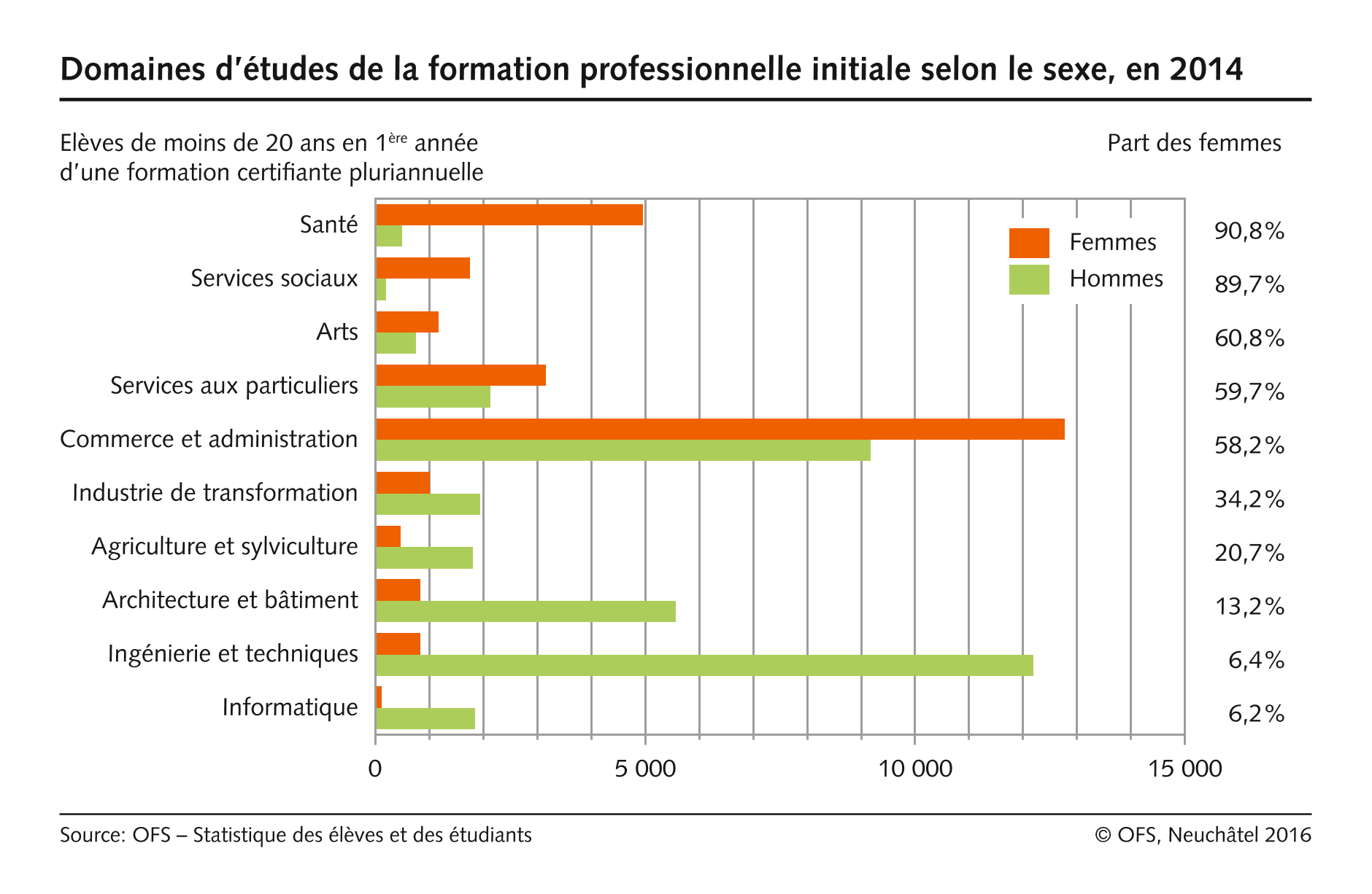 Une étude de l’OFS publiée en 2016 rapporte que le choix de la profession est encore très marqué par le genre. Le domaine du bâtiment est celui qui affiche la plus grande disparité avec seulement 11% de femmes. L’étude observe également que même s’il y a une évolution, celle-ci reste faible.