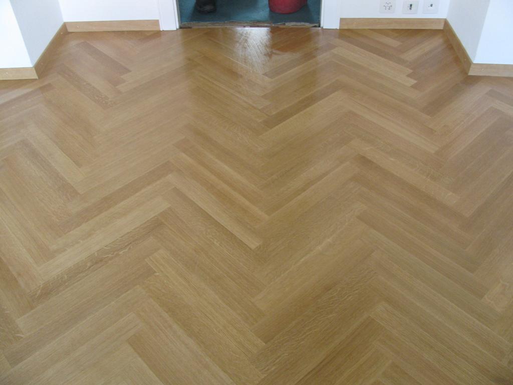 À bâtons rompus: Dans la pose à bâtons rompus, les lames sont disposées en angle droit : le petit côté d’une lame s’emboîte dans le grand côté de la lame voisine. Toutes les lames sont de la même longueur, et la pose démarre au centre de la pièce pour évoluer en direction des murs. Cela donne des pointes originales, dont on ne se lasse pas rapidement.