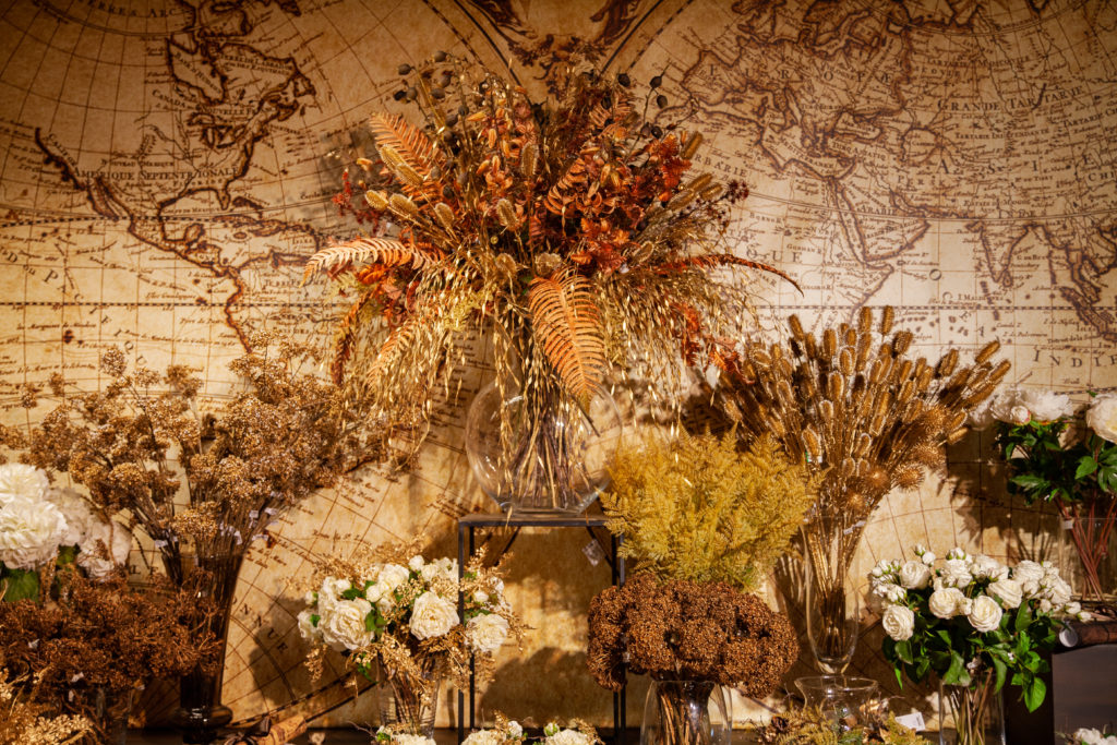 Puis le doré, qui cette année prend des teintes plus froides de vieil or, ou plus chaudes avec des reflets chocolatés quand il ne lorgne pas carrément vers le bronze. Les fleurs artificielles s’enrichissent de branchages tombants, qui brillent devant une ancienne carte marine. On en rajoute sur les lustres, et pourquoi pas aussi autour des cadres?
