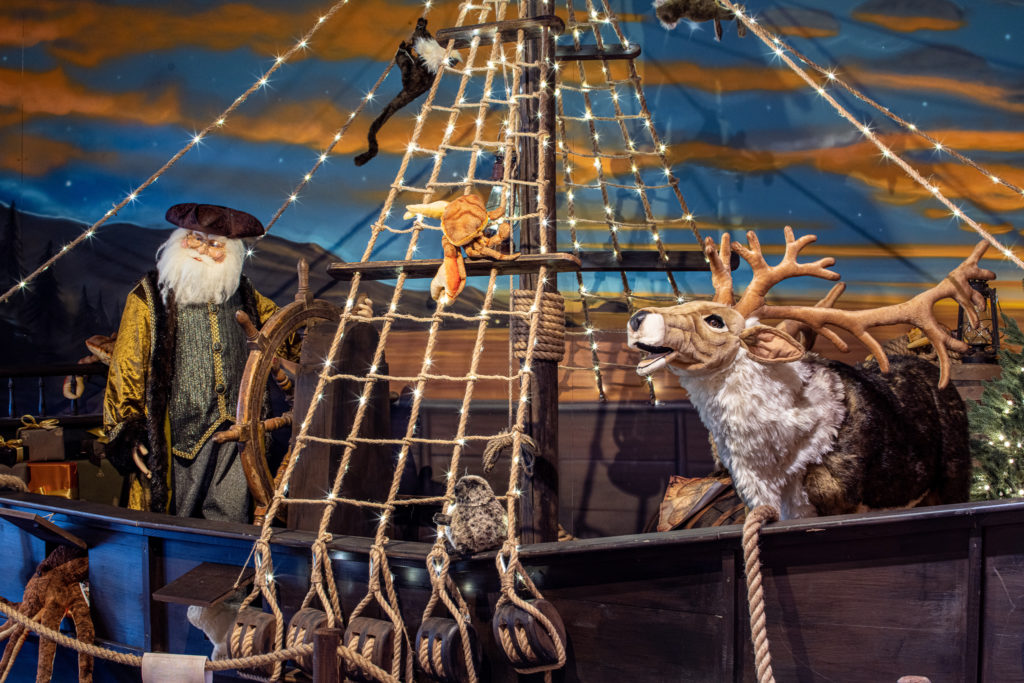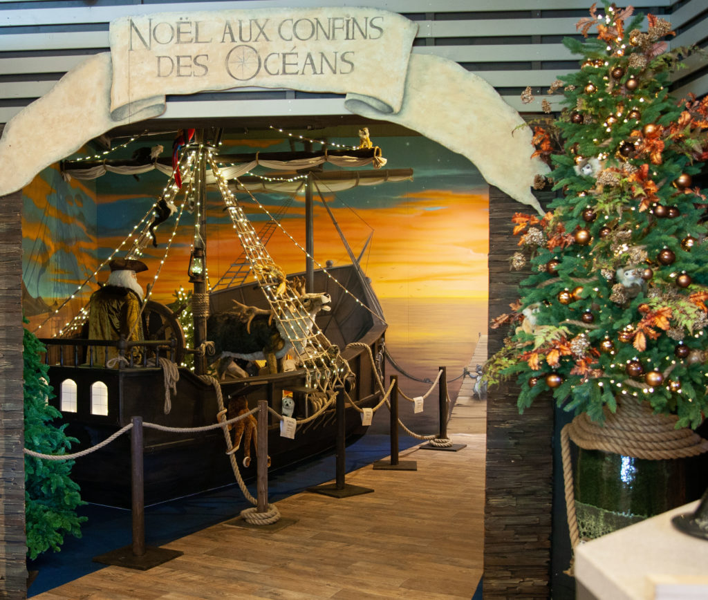 Ces thématiques colorées se succèdent dans les différents tableaux du marché de Noël, soit dans les différentes pièces du navire ou dans les lieux qu’il visite. La cabine du capitaine, avec ses fourrures luxueuses, les fonds marins avec leurs incroyables créatures flottantes créées en métal recyclé par un artiste africain, la banquise avec ses pingouins chahuteurs…