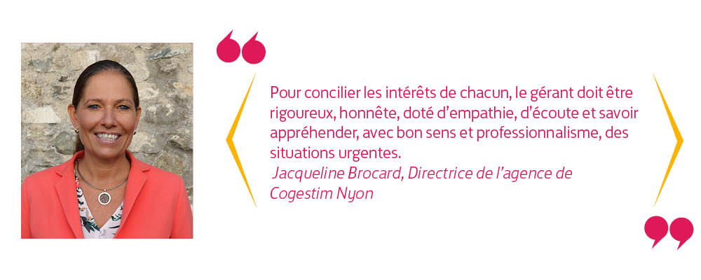 « Pour concilier les intérêts de chacun, le gérant doit être rigoureux, honnête, doté d’empathie, d’écoute et savoir appréhender, avec bon sens et professionnalisme, des situations urgentes et rarement identiques », nous soulignera Jacqueline Brocard, Directrice de l’agence Cogestim de Nyon. Il doit également connaître de nombreux éléments techniques liés à l’habitat. Elle nous rend également attentifs à l’importante pression que subissent les gérants. En effet, « au sein d’une importante masse sous gestion, de décomptes et de relevés, une toute petite erreur peut avoir de grands impacts, tels que la perte de confiance d’un client », nous confiera-t-elle.
